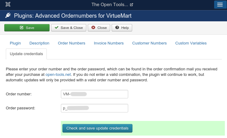 For the advanced (paid) version of the plugin, you need to enter your update credentials (order number and password of the purchase at open-tools.net) in the plugin configuration page (Joomla Backend: Extensions => Plugins):