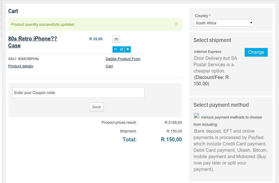I have tried your shop, and to me it always offers the Internet Express shipping method, also above R1080. The postal services method is also available at the "Change" button, So, I apparently didn't understand you issue. Can you please describe the exact steps to reproduce the issue. However, I suspect that there is a problem with your OPC plugin. I added two products and the removed one of them from the cart. Now the Total always shows as R150 (i.e. the product prices are ignored) and the shipping is also calculated as if Amount==0... See attached screenshot. Best regrads, Reinhold |